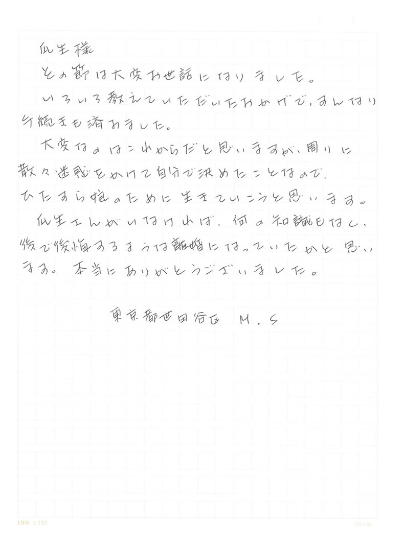 瓜生さんがいなければ、何の知識もなく、後で後悔するような離婚になっていたかと思います。